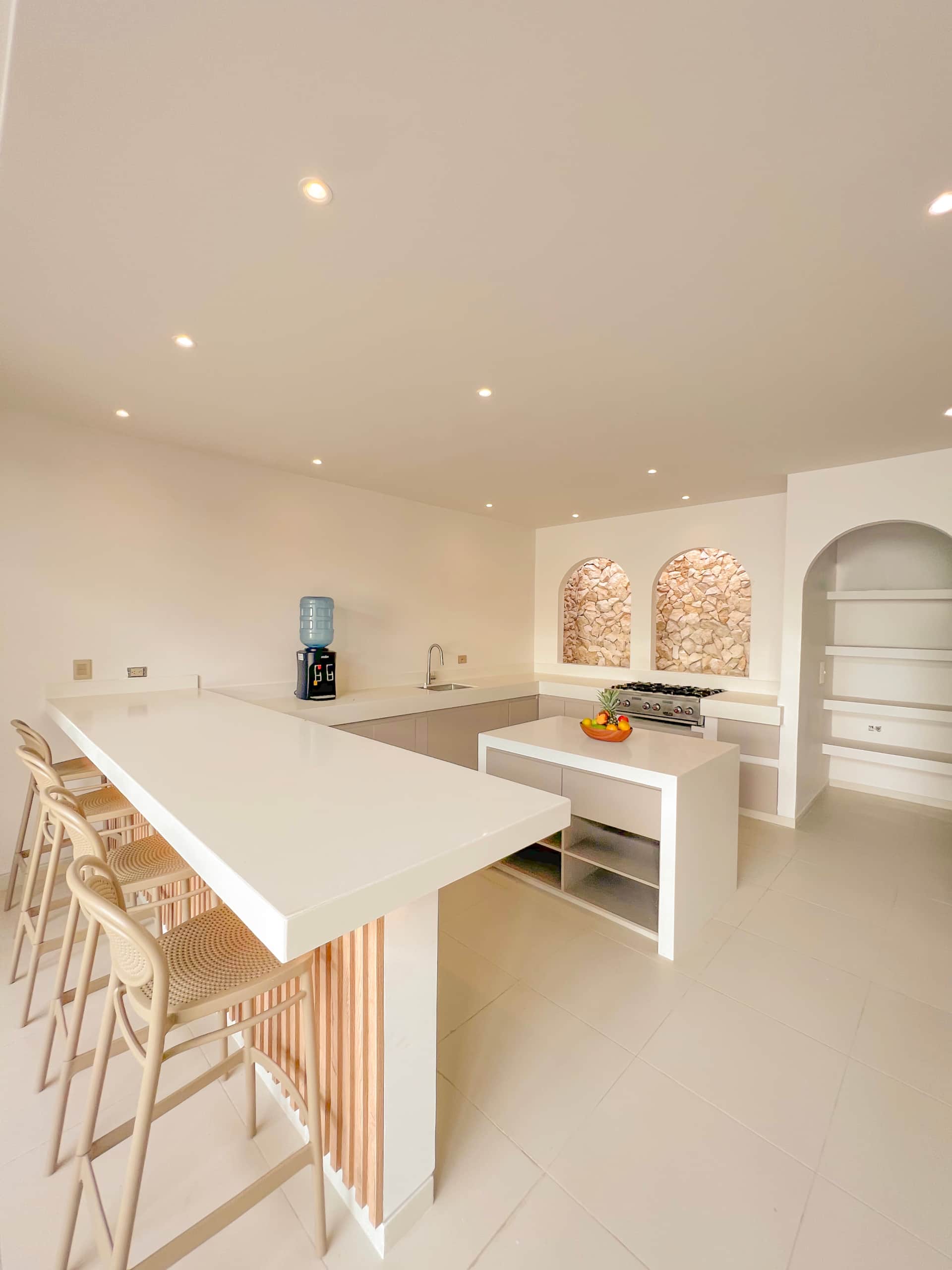 Cocina totalmente equipada, comedor formal con capacidad para 14 personas, refrigerador, congelador, máquina de café, wifi, sala principal con Televisión inteligente de 72″, aire acondicionado, lavadora.