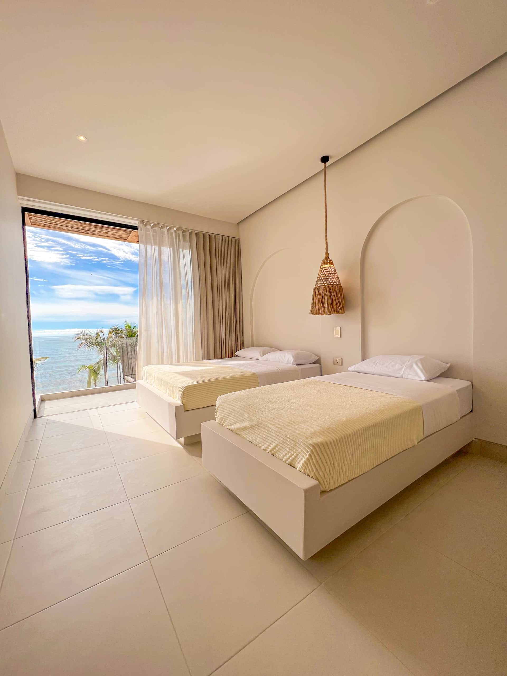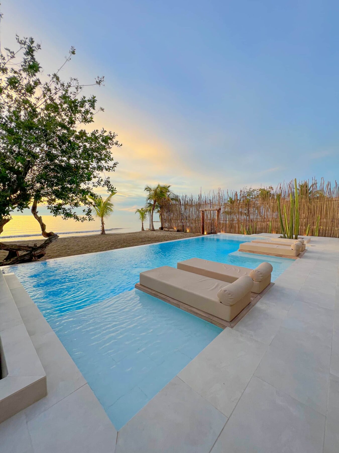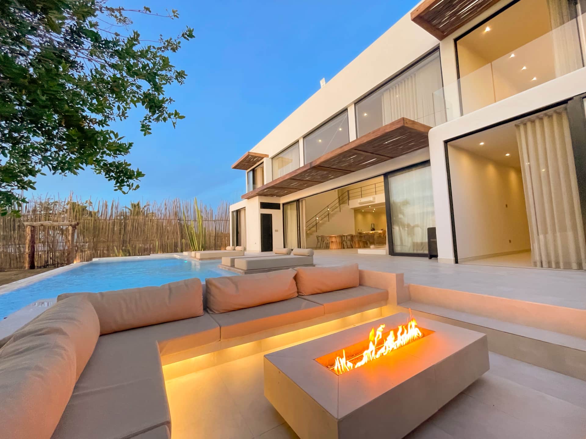 Piscina infinita frente al mar, playa privada, ducha al aire libre, terraza, asoleadoras, sala hundida con fogata a gas, parqueadero privado