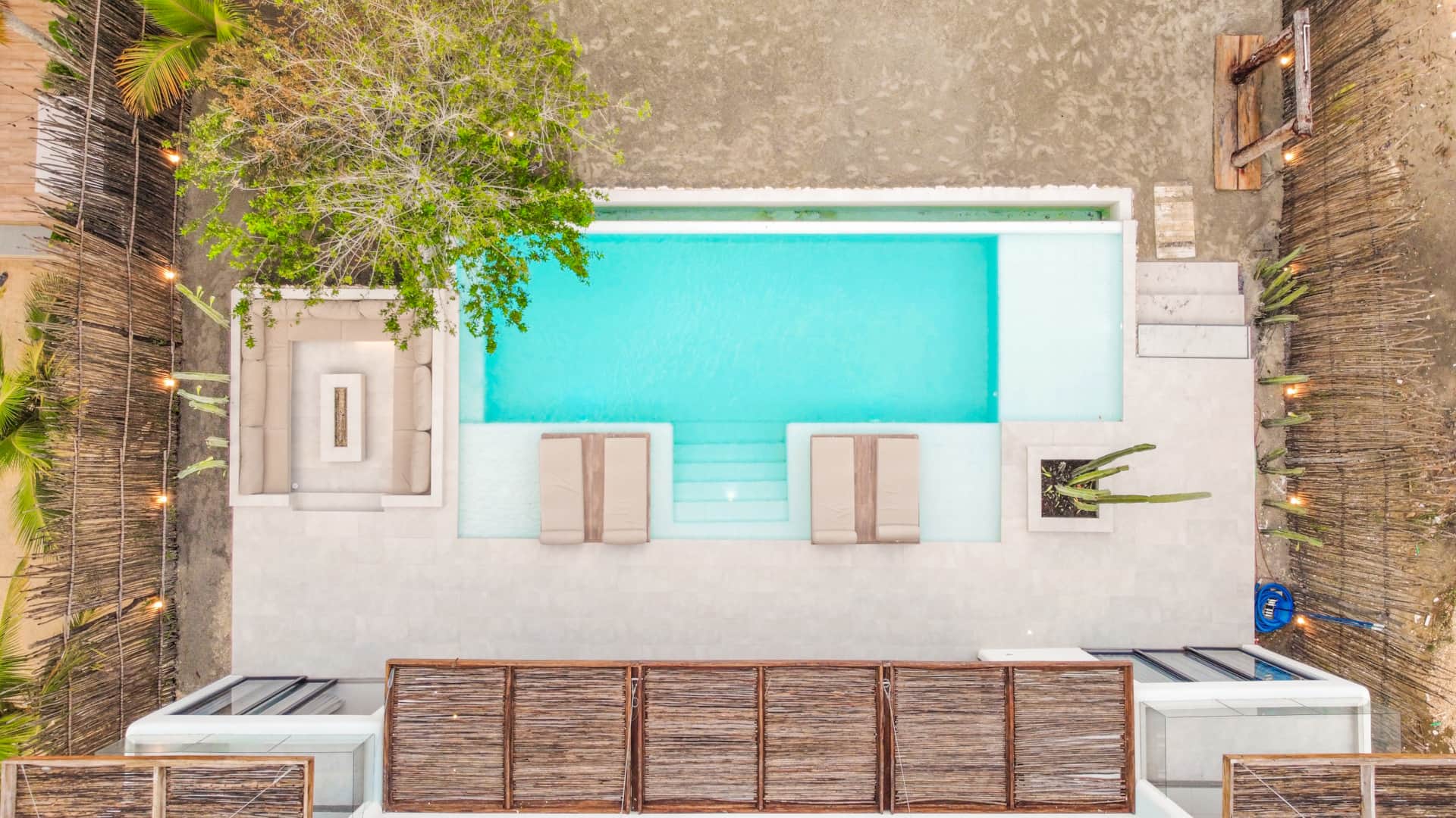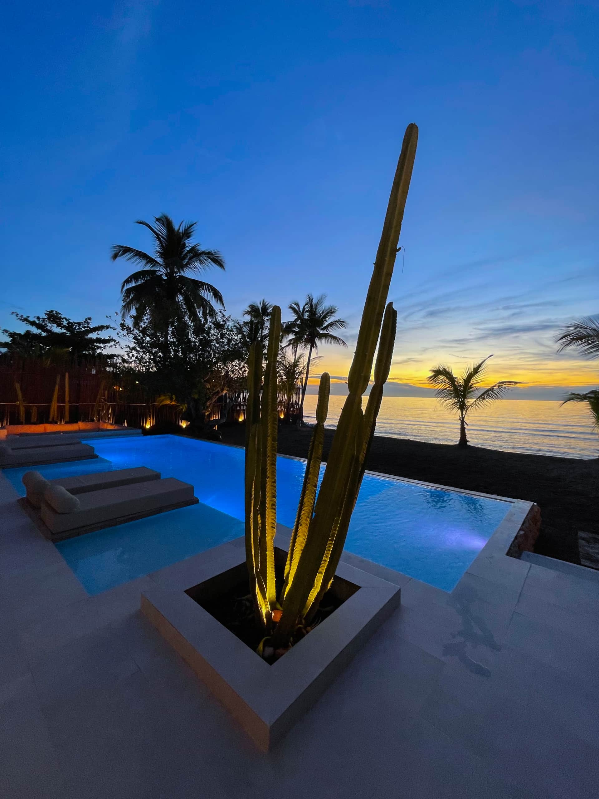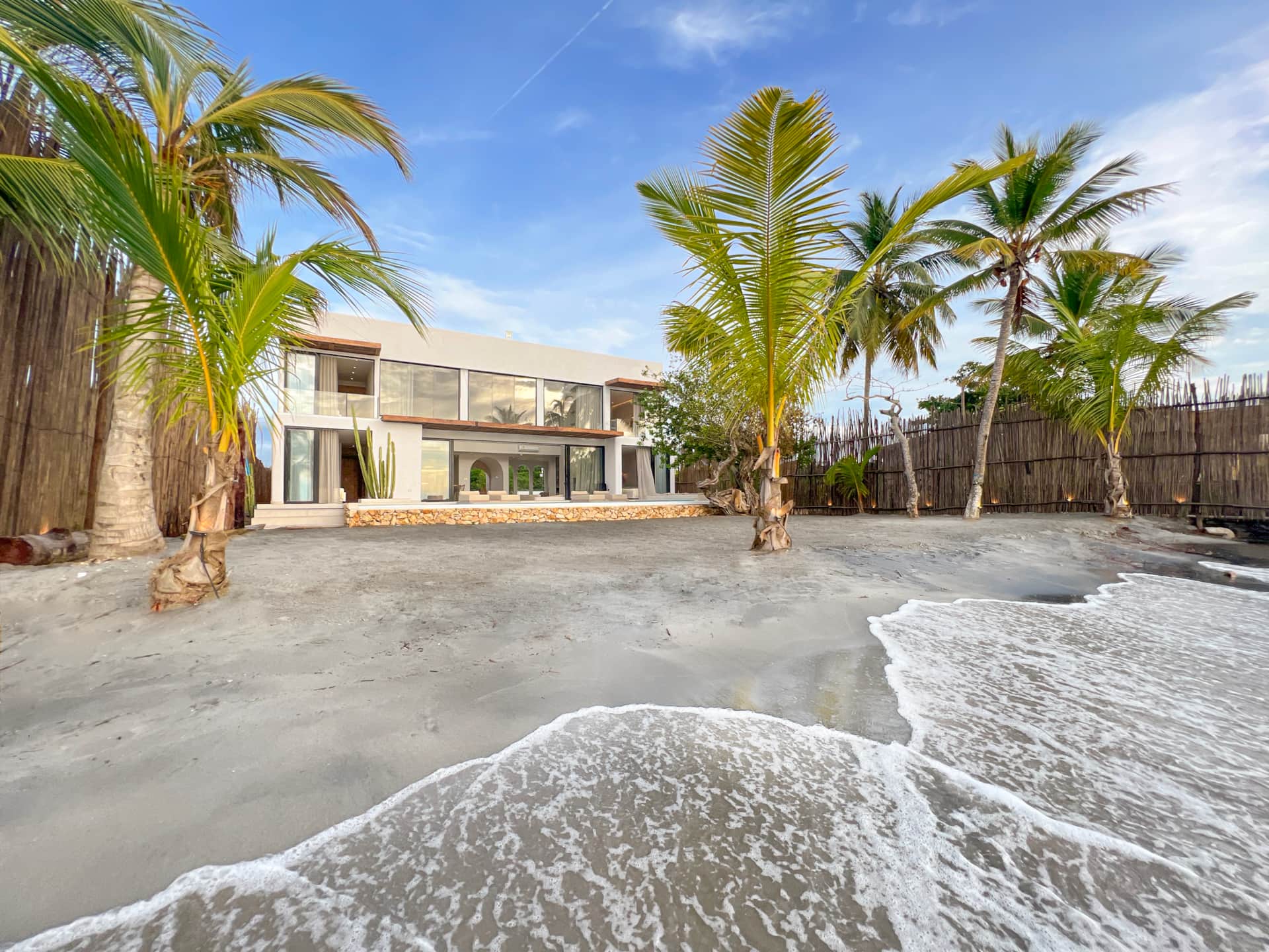 Piscina infinita frente al mar, playa privada, ducha al aire libre, terraza, asoleadoras, sala hundida con fogata a gas, parqueadero privado