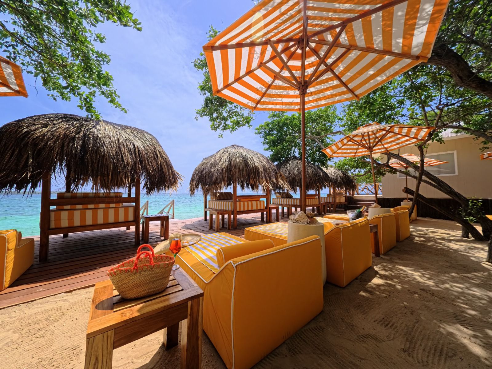 Dispone de múltiples espacios para el disfrute al aire libre, incluyendo camas de playa distribuidas en distintos puntos de la isla con vistas de 360 grados, piscina, kioscos cubiertos, áreas de bienestar tipo spa isleño, gimnasio y varios muelles que facilitan el acceso y las actividades náuticas.